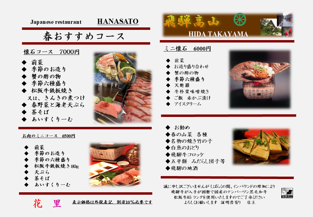 飛騨高山の地酒とお料理 日本料理 花里 季節のおすすめコース 会席コース ミニ会席